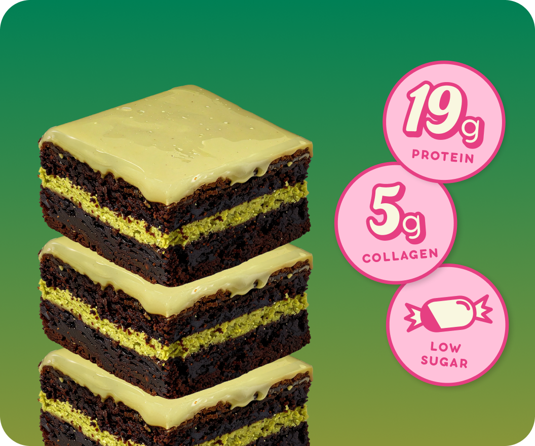 We took a different approach: start with a fudgy, protein-packed brownie base (19g protein, 5g collagen) add the viral pistachio + kataifi filling everyone's obsessed with.