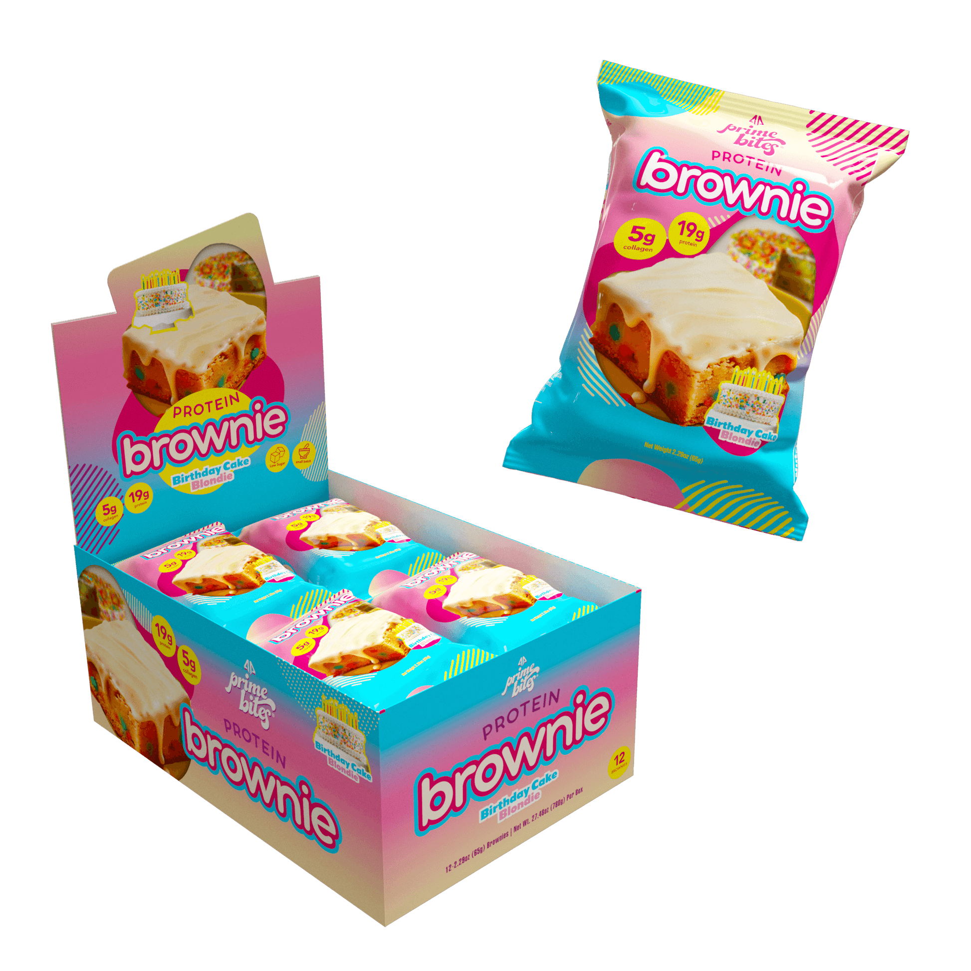 Turn snack time into a celebration with Prime Bites® Birthday Cake — a sweet, sprinkle-topped protein brownie that brings the party without the sugar crash.