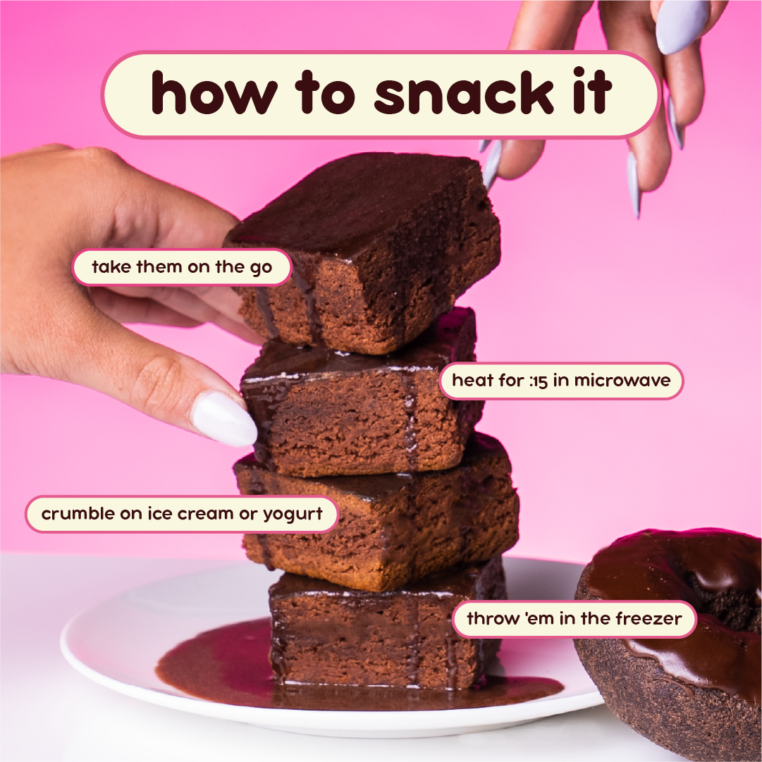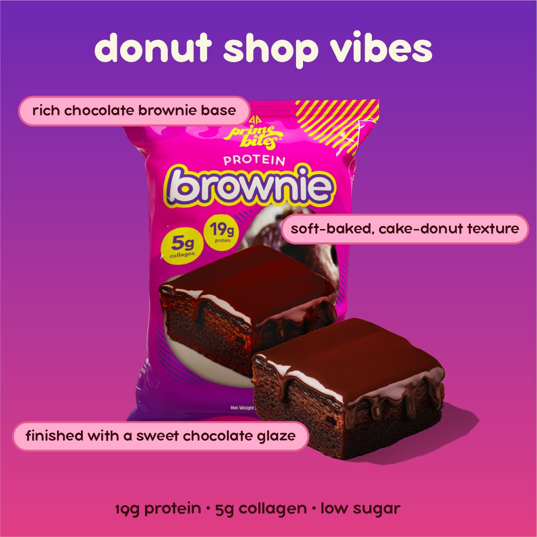 Enjoy a decadent twist on a childhood favorite with Prime Bites® Glazed Chocolate Donut — a moist, rich brownie packed with real cocoa flavor.