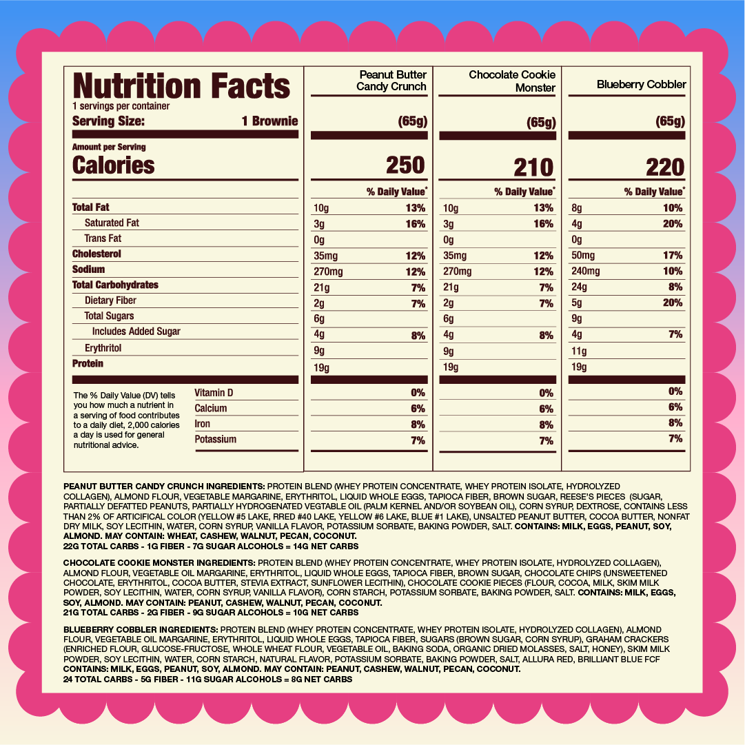 Each brownie contains 19g of high-quality whey protein and 5g of collagen, offering a delicious and nutritious snack option.